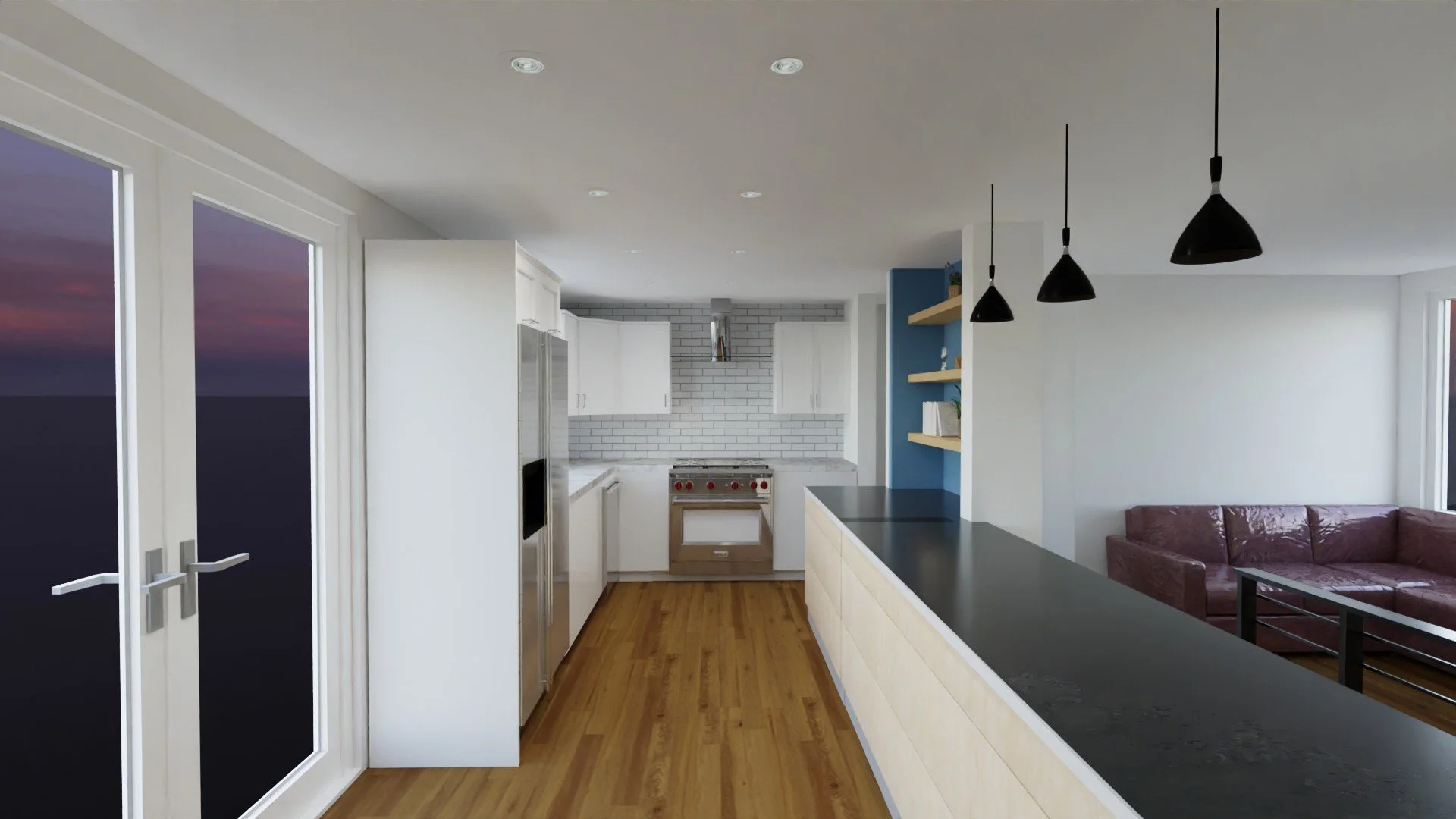 open concept kitchen render, exposed beam in kitchen